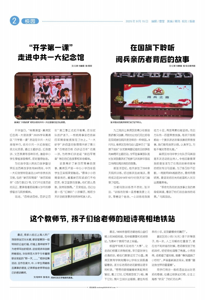 - “开学第一课”走进中共一大纪念馆 文/记者 刘春霞 图/郭容 开学首日,“树德课堂·黄浦区红色周一大思政课”2025学年黄浦区“开学第一课”活动在中共一大纪念馆举行,依托中共一大纪念馆红色文化资源,通过主题讲话、红
