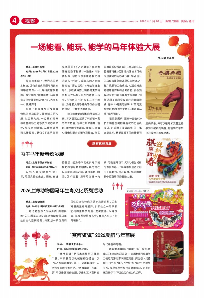 - 一场能看、能玩、能学的马年体验大展 文/记者 刘晶晶 地点:上海科技馆 时间:2026年2月17日至2026年8月16日 故宫珍宝南下,世界名马标本集结,还有沉浸式草原与科技神驹等你交互……上海
