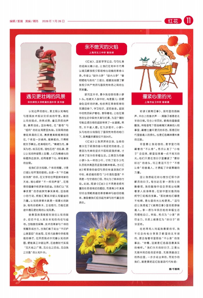 上海市五三中学 谢安然 《红岩》,这部字字泣血、句句吐真的经典长篇小说,让我们在和平年代得以窥见解放前夕那场惊心动魄的革命斗争。作者以“狱外斗争”“狱内斗争”“黎明牺牲与胜利”三部