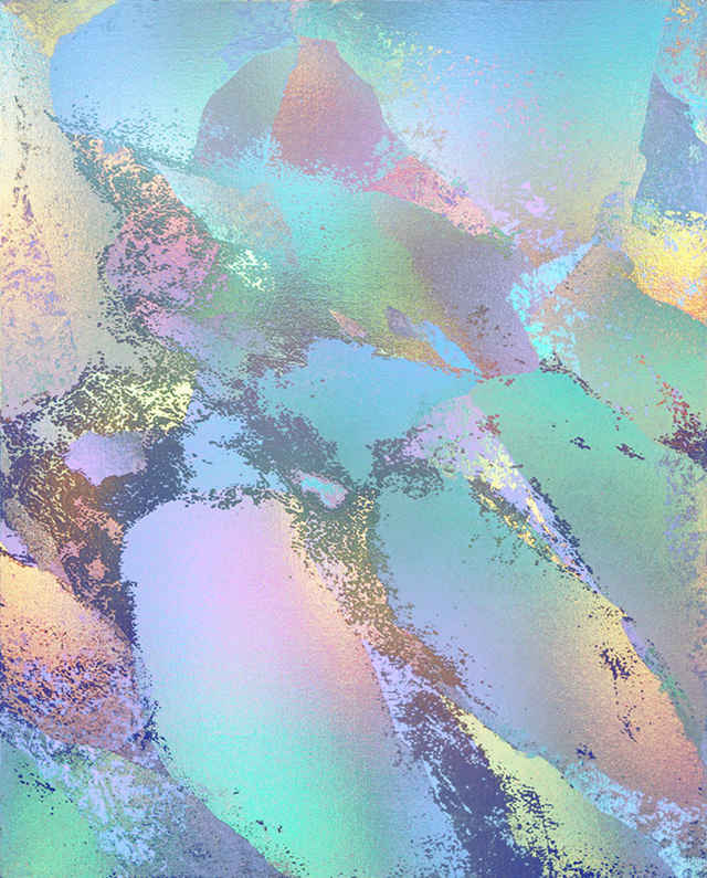 艺术家黄喆善于将材料与绘画,装置相结合,以此来呈现空间中的能量转换与构成。利用材料的光晕散射,对物质与图像进行消解再重构,模糊了时间与空间的界限。《无量的瞬息》作品来源于地质学,展现了地质构造运动(地壳运动)中,由内动力地质作用所产生的沉积、重力分异、变质、扩散、重融再生、结晶等一系列物质状态。