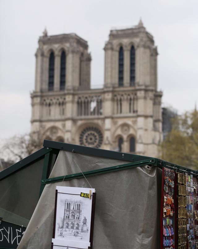 这是4月16日在法国巴黎拍摄的火灾后的巴黎圣母院以及书摊上售卖的圣母院图片。新华社 图
