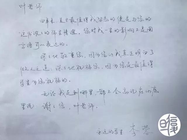 叶春华老师是李蓉人生成长路途上,不可或缺的一位“伯乐”。现任上海文化广播影视集团副总裁的李蓉,曾在毕业之际深情回忆了这段难忘的经历:“四年来,复旦最值得我留恋的便是与您的这份浓浓的师生情谊。您对我一生的影响不是用言语可以表达的。深深地敬重您,因为您让我真正明白了做人之道;深深地祝福您,因为您是最值得学生为您祝福的。无论我走到哪里,都不会忘记在心底里说:谢谢您,叶老师。”(李蓉,写于1993年6月)