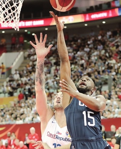 美国队球员沃克(右)在比赛中上篮。