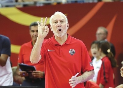 美国队主教练波波维奇在场边指挥。