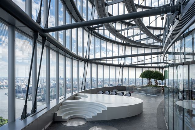 俞挺:来自于我从小的一个执念。我在上海长大,一直觉得上海看不到山。后来到北京读书,上香山,看着层峦起伏,也会感叹为什么上海没有这样的山。第一次去上海中心勘地,坐电梯上到52楼,因为有施工围挡挡着,光线非常暗,但拉开施工围挡,阳光透进来,再走到空中花园,看到了脚下的城市景观,突然就感觉像在一座山上。200多米的高度,恰恰好,有那么一点距离,但底下的上海又都在你身边的样子。当时我的脑子里就脱颖而出:为什么在上海中心这个完全现代化的垂直城市中,不能创造一个由山水灵感激发的读书的公共空间呢?