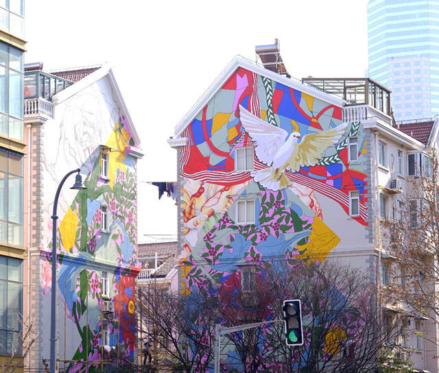 艺术家通过涂料彩绘的方式,在居民楼外墙上进行创作,呈现了“花语白鸽”这一彩绘主题,画面色彩饱满绚丽,有花有鸟,充满生机和活力。