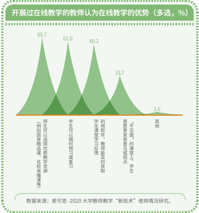 数据显示,超过六成教师认为在线教育优势在于提供更多可选的课程资源,学生可以灵活安排学习时间,以及教师可以利用软件及时获取学生课堂学习反馈。