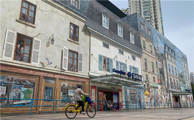 你瞧,刚走上武宁路桥,三层家乐福就在桥畔,蓝天白云下的埃菲尔铁塔,欧式建筑,家乐福外立墙面被仿真壁画包裹着,纵然颜色已不那么鲜亮,却还能感到犹存的气势。