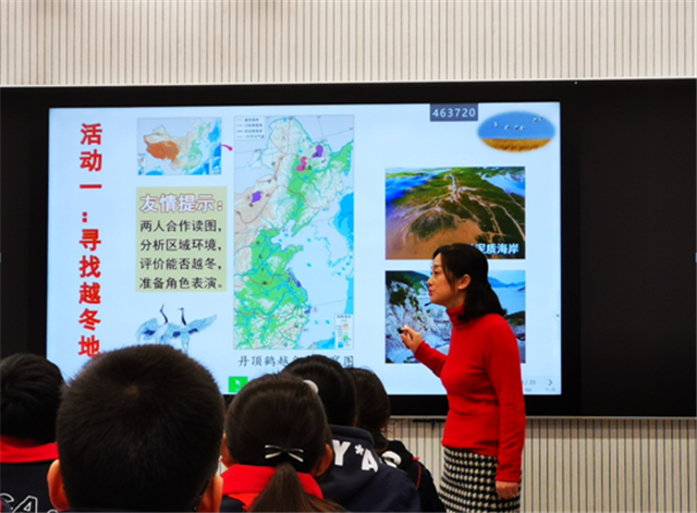当天是雨天,但这一切未阻挡前来参加教研活动的老师们脚步,参会者有来自市中心静安、虹口、长宁、普陀等区,也不乏有来自崇明区、奉贤区、金山等远郊学校的老师。因为他们对这堂由静安区教育学院附校地理教师盛丽芬执教的《丹顶鹤去哪里越冬?》公开课有所期待。毕竟,跨学科融合教学对自己是一个全新的挑战。上课伊始,前来听课的老师都拿出笔记本认真记录下盛丽芬老师的板书,拿出手机拍下盛老师上课的每一页PPT,唯恐遗漏了课堂要点。