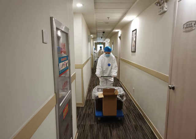 医护的工作性质较为特殊,医护的24小时倒班制,决定了后勤保障也必须24小时跟进。医护下班是酒店工作人员最繁忙的时候,如垃圾清运、按需发放物资和药品、提供客房保障服务等。隔天一次的核酸检测日,全体人员均要出入,酒店工作人员的工作量更是翻倍。