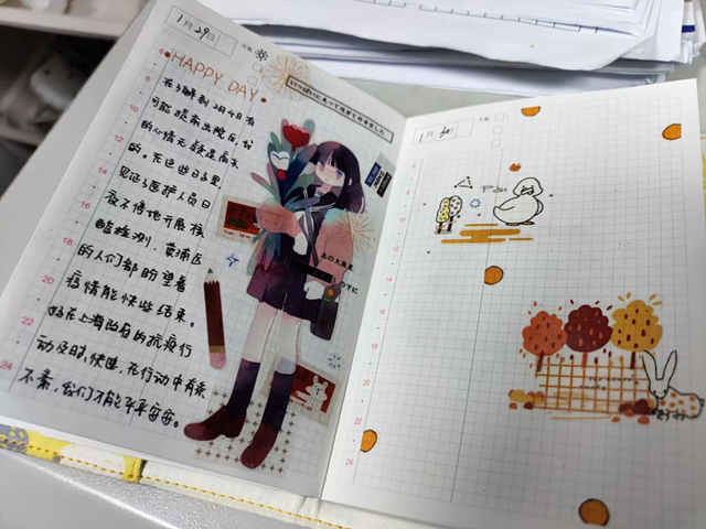生病之后,她爱上了写手账,手账本基本不离手,“一开始是为了记录心情,后来发现可以宣泄、放松,在写字、排版、贴纸的时候,得到了许多快乐。”今天,小徐的手帐上写着“Happy day”。