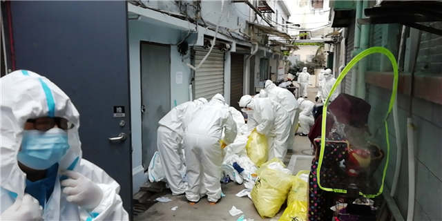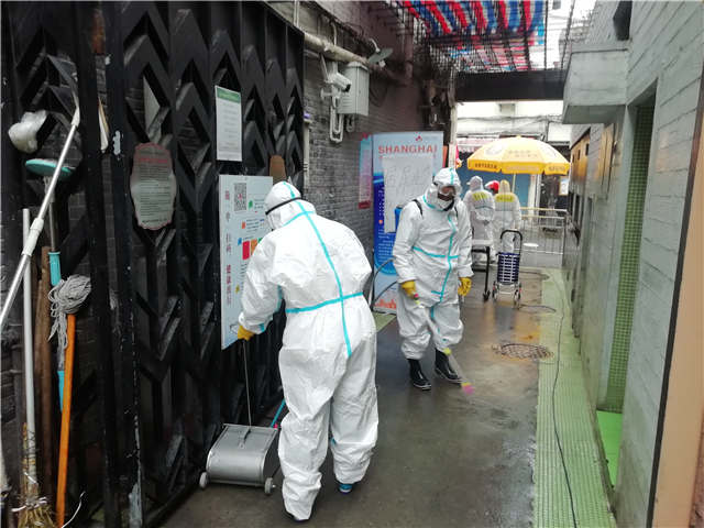 在黄浦区贵西小区实行封闭式管理后,黄浦城发集团下属的欣谊公司17名环卫工人放弃了休息时间,和家属一起组成了20人的清洁队,分区包干,守护贵西小区的市容环境。