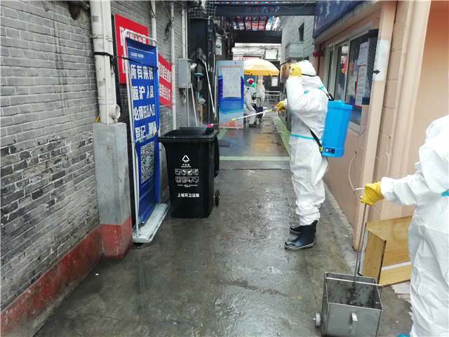 拿到公司运来的“装备”后,他们根据各自的居住地,划分北京东路830弄、贵州路297弄、北京东路850弄共3块作业区域,每块由一名块长负责所有环卫作业任务安排。穿上防护服,戴上护目镜、双层口罩手套,拿着加厚垃圾袋,带上装满消毒液的喷雾器,清洁队队员们前往各划块区域,严格按照规范进行保洁作业。他们的工作重点是两方面:生活垃圾的清运及消毒;倒粪站的值守与清理。