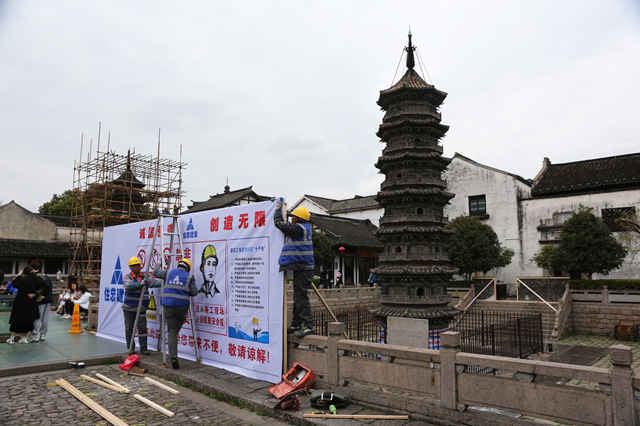 今天一大早,工人们就陆陆续续将各种建筑材料搬入这里。当年,为了尽量保持砖塔旧貌,塔基座落在宋代的地基上,离地面约有2米,游人参观需拾级而下。这次施工期间,将会把下沉式入口封掉,施工区域进行围挡封闭,保护地面与台阶、确保工程安全。据悉,明天开始,工人们就会开始搭建脚手架,所有的前期准备工作将在3月15日结束并进入正式的修复工作中。施工期间,请周边居民以及南翔老街景区内的游客注意安全。