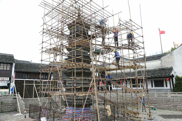 今天一大早,历经千年的南翔寺砖塔进入“修缮时间”
