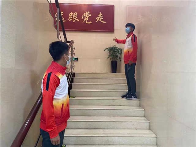 去年7月1日当天,海港队的师兄们也曾在渔阳里纪念馆担任志愿者,李圣龙和张卫在入口处负责检测体温,做的非常专业细致。如今入口处已经换成了自动测温枪,可上海U18男足球员们的志愿服务依然很贴心,两位志愿者在楼道处负责引导游客,还有几位志愿者则在互动展厅为游客介绍互动环节和多媒体操作步骤。