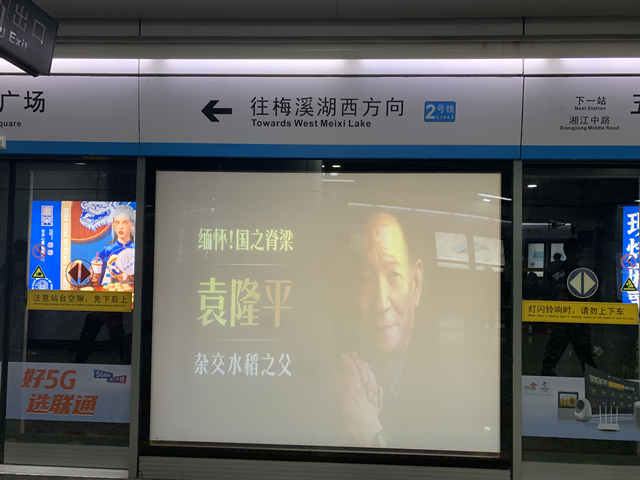 在赶往长沙明阳山殡仪馆的地铁里,他发现平时的广告位都变成了“缅怀国之脊梁袁隆平”的纪念海报,同行的都是捧着悼念鲜花的民众。等候在地铁站外的出租车车窗上夹着几朵鲜花,司机无偿送民众到殡仪馆门口。