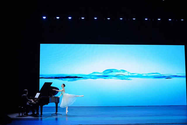 一段钢琴伴奏的芭蕾独舞《水之源》拉开活动序幕。行云流水般的舞蹈和钢琴演奏恰如其分地展现了水的质感,突出了“水是生命之源”这一共识。
