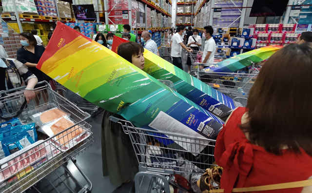 山姆就连购物车都是特大号的。工作人员说,购物车的大小,是根据会员提出的建议改造的,十年前刚进驻上海的山姆,购物车还是普通大小。