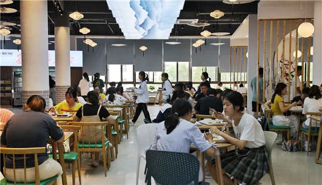 除了更加个性化的选择模式、全新的风味品种,食堂“本堂”也进行了视觉风格大提升。“这边几乎全天开放,用餐高峰结束后,餐厅可以变身自修室。空间相对独立,安静,炸鸡、奶茶、咖啡小铺的引入,让同学们便捷享受到美味下午茶,通过美食、科技、娱乐、学习等多维融合,使食堂也变身成为一个集餐饮、交往、休闲于一体的多功能育人场所。”范效杰说道。