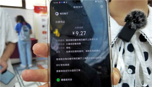 中午,王静仪来到食堂,拿取托盘,并用微信绑盘,再在每个想取餐的菜肴边指定区域放盘再取餐,全部打餐完毕,于出口处自动结账扣款。王静仪总共选了一块红烧肉、一只盐水虾、一个可乐鸡翅、三种蔬菜、两只冬枣、两只圣女果,一份米饭一份汤,总计9.27元。“我非常喜欢这样的方式,完全不用担心浪费,吃的种类也更多样了!如果要深究,我还能在手机里直观查询到每一款菜品所含的卡路里,更加注重健康饮食。”