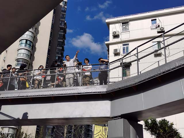 当然,设计师的功力不仅仅在于满足生活,百禧公园的艺术范也是杠杠的。刘宇扬带着居民们走上南北两段的连接点,那是一座跨兰溪路的小桥,这座桥,以江南水乡拱形桥为蓝本,走上小桥顶端,便有了在水乡桥上登高的感觉。放眼望去,一面是大树的树梢,绿意一片,一面,窄窄的兰溪路从树叶间露出半边,像极了水乡的小河。步道南侧,以环形廊桥连接左右的直线云桥,前后各有一颗朴树穿过云桥空隙,随着生长茎叶相互缠绕,行经其中可碰触枝叶,让人有了云端行走的感觉。
