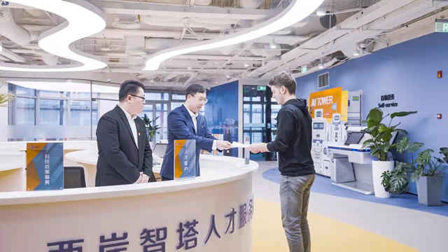 来到西岸智塔5楼的党群服务站,这是一个2200平方米的公共空间,包含党群活动、人才服务、商务洽谈、企业联络、生活保障、个性互动等6类功能空间。站内特别设置人才服务岛,由徐汇区委组织部牵头,区人社局、科委、知识产权局、房管局等轮流入驻,现场提供政策咨询和事务受理服务。