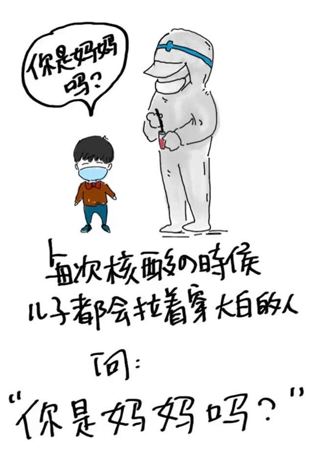 韩燕负责社区11-17号楼以及51-59号楼,正好包括了她所住楼栋。每次穿着“大白”服走过自家楼栋,她都会抬头望向三楼的窗台,3岁的儿子向她挥手。“在家有没有听爷爷、奶奶的话?”偶尔韩燕会朝着儿子问几声。“妈妈,我听话的,我很乖。”而每次小区开展核酸筛查时,孩子还会拉着穿“大白”的人问:“是妈妈吗?”在现场忙碌的鲍莉听闻后都感到心酸,更觉得韩燕的不容易。