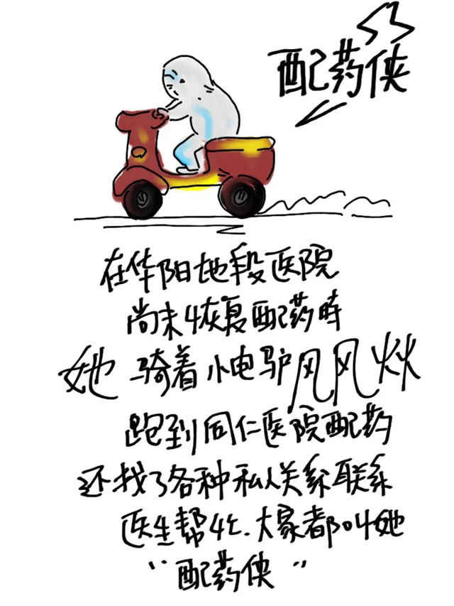 在社区对口的地段医院尚未恢复配药的时候,韩燕骑着自己的助动车,风风火火跑到同仁医院配药,有了“配药侠”的称号。