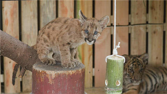 此次和游客见面的都是大猫家族的成员,分别为2只美洲狮幼仔和2只孟加拉虎幼仔。2只美洲狮幼仔是枫糖(哥哥)和奶糖(妹妹)。两个小家伙今年6月23号出生,别看“双糖”组合只是3个月出头,运动能力那可是一流,房间里的栖架就是为了其出众的攀爬能力准备的。另外2只一同展出的孟加拉虎幼仔也是动物园的小明星,稍大点的是经常出现在公众号的孟加拉虎小爱是个男孩子,性格很温和。而旁边那只稍小的孟加拉虎七七是个女孩子。它的脾气没有小爱那么好,是个不折不扣的女汉子。