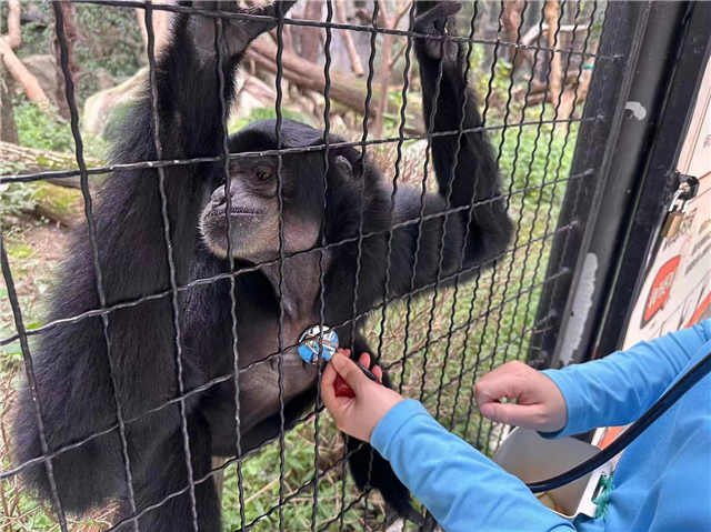 合趾猿是体型最大的长臂猿,合趾猿发发也是上海动物园灵长动物中的小明星,在饲养员的指挥下,它会乖乖地坐在专属小木桩上,等待训练员的指令,完成一系列动作,展示身体各部位,并接受饲养员的“体检”。