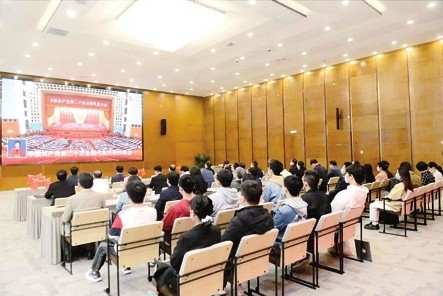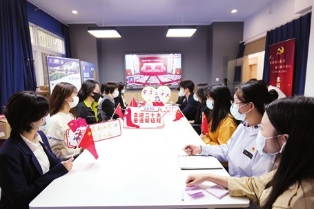 在中国第一高楼——上海中心大厦22楼的陆家嘴金融城党群服务中心早早坐满了两新组织的党员们,集中收看大会盛况,认真聆听二十大报告。