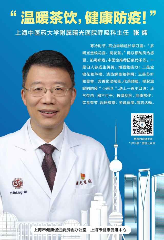 温暖茶饮,健康防疫!寒冷时节,耳边常响起长辈叮嘱:“多喝点金银花露、菊花茶。”用以预防风热感冒、热毒疖疮。中医也推荐防疫代茶饮,一是白人参或生黄芪,增强免疫力;二是金银花和芦根,清热解毒和养阴;三是苏叶和藿香,芳香化湿祛毒。代茶频服,撑起温暖的防疫“小雨伞”。送上一首小口诀:正气存内,邪不可干;按摩刮痧,健康常伴;饮食有节,起居有常;劳逸适度,情志达畅。