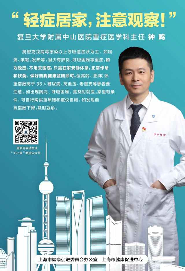 轻症居家,注意观察!奥密克戎病毒感染以上呼吸道症状为主,如咽痛、咳嗽、发热等,很少有肺炎、呼吸困难等重症。如为轻症,不用去医院,只需在家安静休息,正常作息和饮食,做好自我健康监测即可。但高龄、肥胖(体重指数高于35)、糖尿病、高血压、老慢支等患者要注意,如出现胸闷、呼吸困难,需及时就医。家里有条件,可自行购买血氧饱和度仪自测,如发现血氧指数下降,及时就诊。
