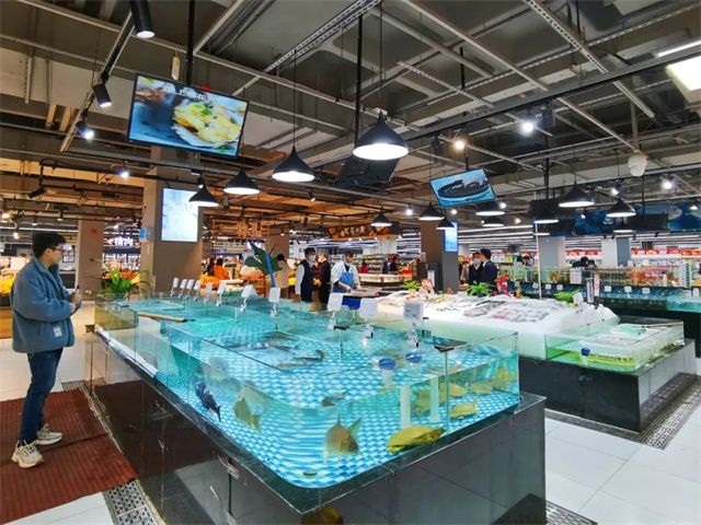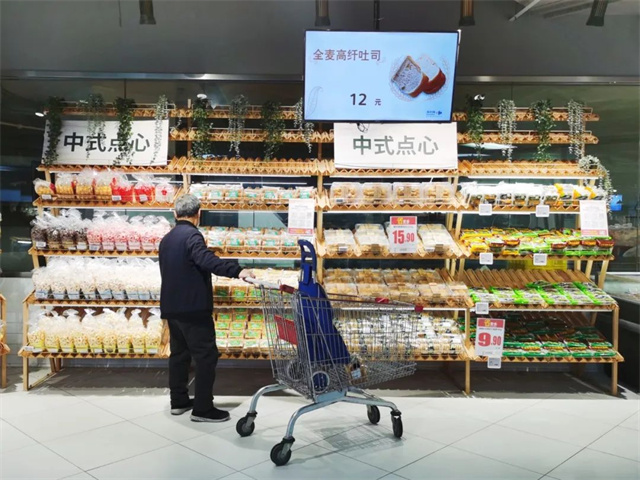 来到3层的精品超市,高销量民生单品、网红爆款商品、品质化商品等一应俱全。烘焙区,法棍和欧包摆满货架,居民也能在此购买到各类中式点心。熟食档口内,包子、馒头等面点,结合南北特色的美食让人应接不暇,店内特别设置餐饮区域,购买后亦可现场品尝。水产区,鲜活的鱼类、海鲜等受到居民欢迎,更有高品质的三文鱼新鲜直送。蔬果区,平价本地时蔬、有机优质蔬果可供不同需求的市民选购。肉类区,牛腩、五花肉、大排等品种齐全,爱森、金锣等冷鲜肉品牌让人买得安心又省心。