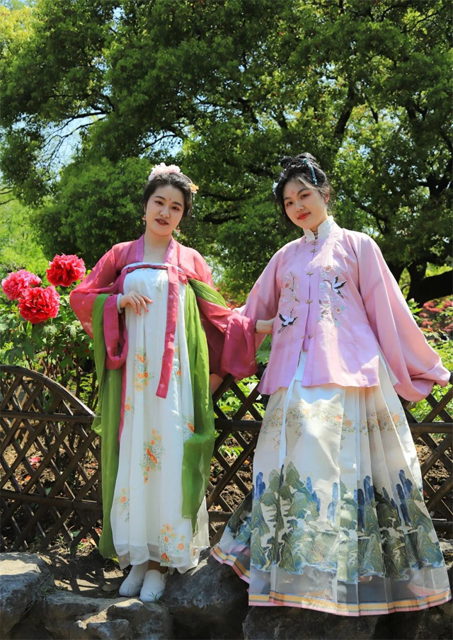 听完了缠绵婉转的昆曲,记者又跟着穿着汉服的上海工艺美院学生好好地逛了逛牡丹园,大家身着制作考究的汉、唐、宋、明历代汉服,或是翩翩漫步,或是轻歌曼舞,裙裾飞扬间,极尽优雅。汉服的国风之美与牡丹的华贵之韵相互映衬,让市民游客感受到不一样的国风魅力。