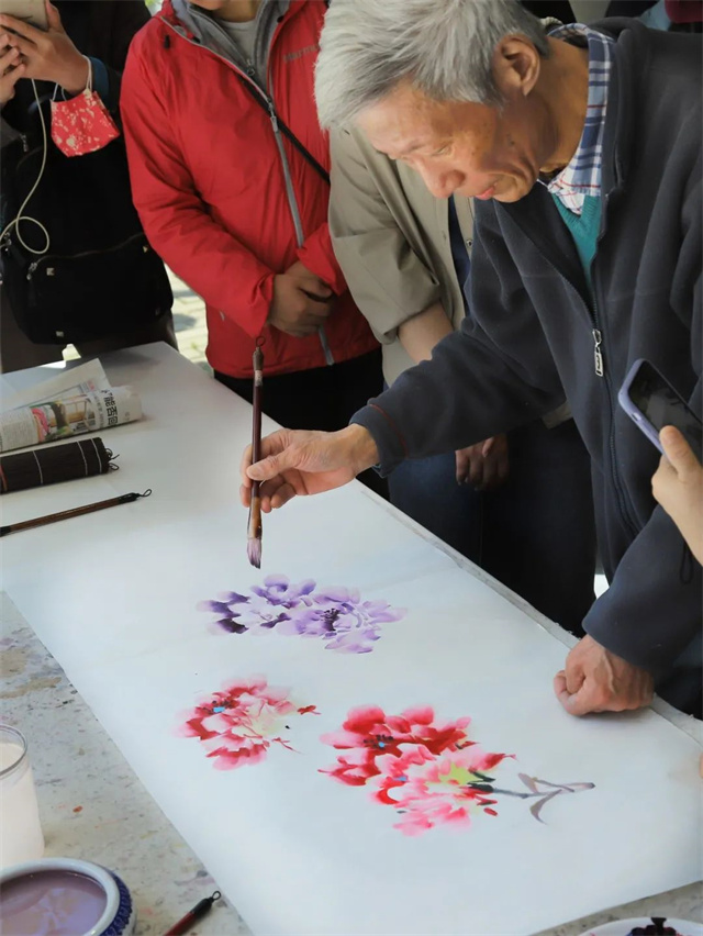 在牡丹园不远处的兆丰印记里,不少市民在围观新华社区学校国画教师朱钟德现场绘制牡丹国画,他带了不同类型的毛笔,细细勾勒牡丹花花蕊、花瓣,他边画边教,不仅展示了牡丹的美丽,还表现了花卉文化和传统文化的融合,受到市民游客的好评。