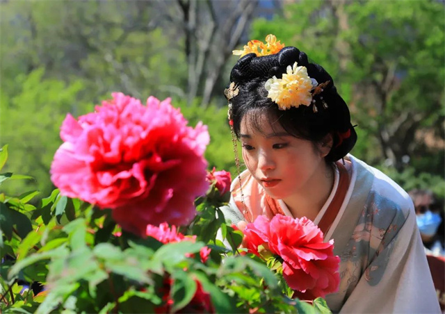 记者看到,许多汉服爱好者相约穿着汉服游园赏花。住在古北的孙女士约了同样是汉服爱好者的两位邻居一起来游园,她们穿上了不同款式的汉服,还精心化上了具有代表性的汉唐妆容,化身牡丹园里最靓丽的“牡丹仙子”。