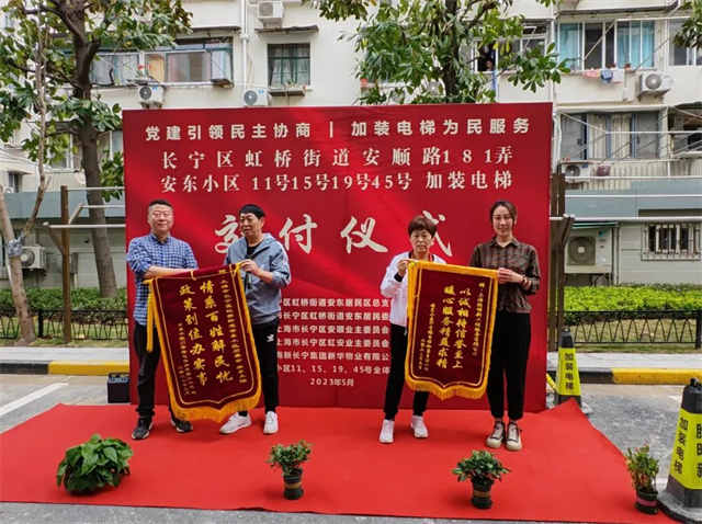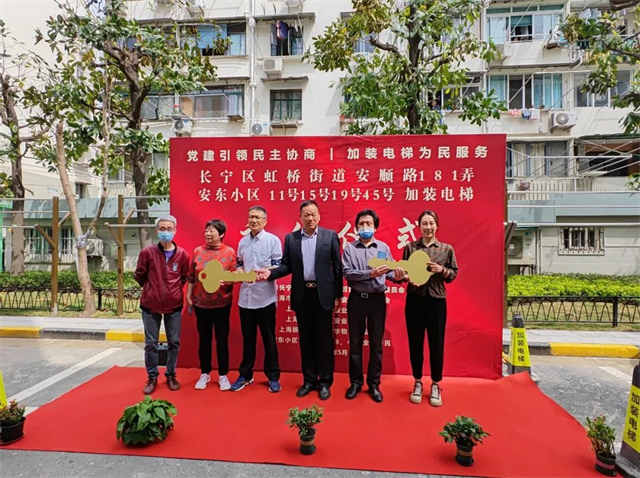 “精品小区马上就要竣工了,一台又一台的加装电梯起来了,让我们的幸福指数不断提升。”5月6日,在虹桥街道安东小区举办的四台加装电梯集中交付使用仪式上,11号、15号、19号以及45号居民楼的居民们激动不已。短短三年内,安东小区已建成使用电梯10部,另有9部在建,加梯速度不断提升。