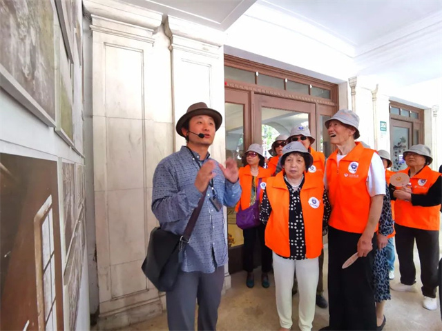 “中华人民共和国国歌《义勇军进行曲》正式问世前曾在武康大楼响起,由当时居住在这里的电影明星王人美弹奏试听。”每到一处景点,周培元便介绍起该处的建筑特色和那些鲜为人知的历史故事,老人们听得津津有味,时不时还掀起一阵热烈的讨论,让这支橙色的队伍更添活力,也成为路上的一道特殊风景线。