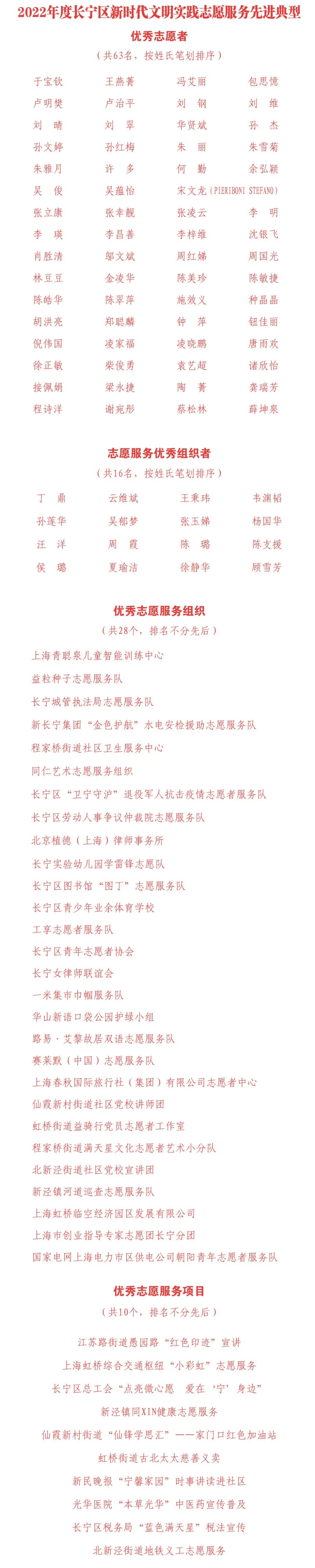 经单位推荐、专家评审,近期,长宁区2022年度区新时代文明实践优秀志愿者、志愿服务优秀组织者、优秀志愿服务组织和优秀志愿服务项目名单出炉。