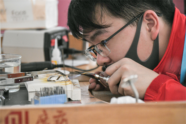 杨逸飞是由上海竣豪职业技能培训中心选送的“00后”大男孩, 在校学习期间,他喜欢上了珠宝加工,除了学好专业课程,还利用课外时间主动钻研,技能水平得到了飞速提升。凭借在珠宝加工项目中的出色发挥,他先后荣获国家第一届职业技能大赛优胜奖、第46届世界技能大赛上海选拔赛二等奖等荣誉,其铜雕作品被杭州工艺美术博物馆收藏。