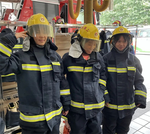 “哇......是消防车。”一进消防站,女足成员们就被威武霸气的消防车深深吸引。活动中,消防员为女足成员们介绍了消防车辆及随车器材装备的名称、功能和用途,同时现场演示了战斗服的穿戴。在消防员的帮助下,女足姑娘们试穿了消防灭火服装,并登上消防车,真正体验了一把成为消防员的感觉。