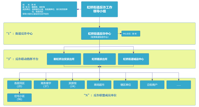 街道成立了反诈工作领导小组,由虹桥街道党工委副书记担任组长,虹桥路派出所所长、新虹桥治安派出所所长担任副组长,形成齐抓共管、综合治理的整体格局,同时打造“1+3+N”的防范电信网络诈骗工作体系。