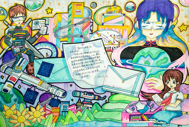 廖晨沁同学则给未来写了一封信:“我希望在未来的时空里,地球保持山清水秀,海洋生态越来越和谐,空中列车快速且便利,未来科学实验室将满足孩子们的一切想象。”