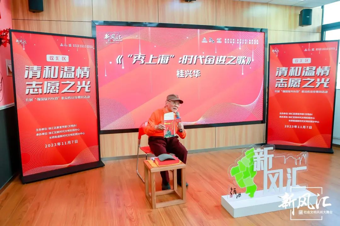 桂兴华是名满沪上的“红色诗人”,他创作的一系列作品,屡屡在浦东、上海乃至全国掀起朗诵热潮。曾多次为桂兴华朗诵诗作的著名表演艺术家丁建华评价道:“桂兴华的诗作,强烈地印上了时代的标记,及时地喊出了时代的声音。”不久之前,桂兴华刚刚把《秀上海》大型组诗的118页手稿,捐赠给了全新开放的上海图书馆东馆。活动现场,桂兴华为大家带来主题宣讲《“秀上海”:时代奋进之歌》。经他多年精心培育、打造的“春风一步过江”朗诵团,为大家朗诵“秀上海”新作中的代表作品《未来在打桩,打桩!》。