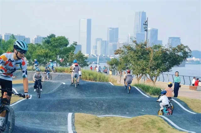 此外,在西岸滨江南段还有全新开放的S1泵道。泵道作为一种世界范围内非常受欢迎的运动场景,几乎适配所有带轮运动项目,包括:小轮车、山地车、滑板、陆冲、轮滑等。S1泵道作为西岸滨江南段一处“活力泵站”,正源源不断为沿江注入全新体育新风潮,为全年龄段的市民游客带来全新运动体验,同时也为西岸滨江增添更丰富多元的体育场景。