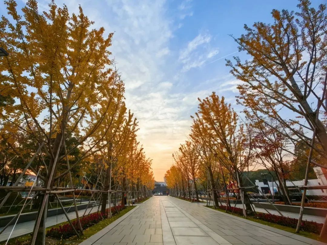 紧邻龙华烈士陵园的广场入口,有一条以银杏为主要元素的银杏大道。满目金黄伴着千年龙华塔的美景,古朴宁静又充满生机。