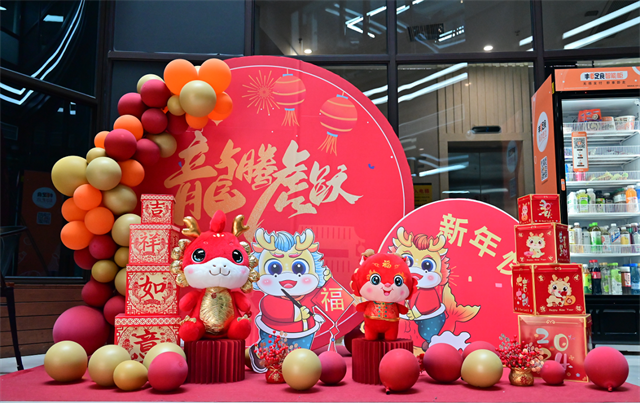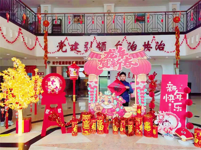 金色的幸福树上挂着柿子和“福”字挂饰,象征着事事如意、福气满满;火红的贺岁鼓里一幅“鲤鱼跃龙门”年画寓意着年年有余、更进一层;一个“飘雪舞狮”落地路灯正播放着喜庆的音乐;居民们在一个大大的龙年新春相框前拍照……在虹桥新城的乐邻之家,物业工作人员们别出心裁的春节布景吸引了不少居民前来打卡,感受春节即将来临的喜悦。