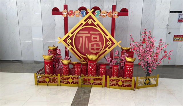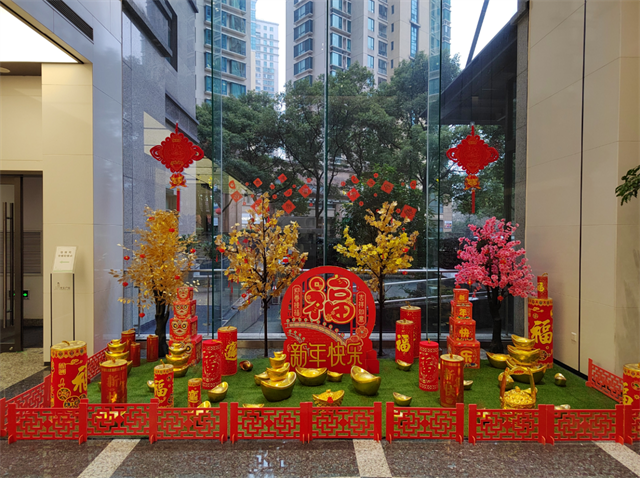 缤谷大厦商务楼的大门贴上了印有“年年有余”的窗花和“福”字,大堂的桃花树造型更显明艳喜庆,各种布景和装饰所营造出的浓厚年味,也让办公楼充满了温馨与活力。